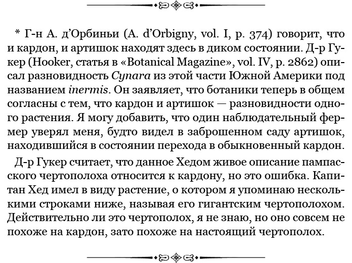 На холмистых равнинах, занятых этими обширными зарослями, не может жить никакое другое существо. Но до того как кардон ввезли сюда, здесь, должно быть, как и в других местах, буйно росла трава. Сомневаюсь, чтобы был известен какой-нибудь еще случай вытеснения в таком огромном масштабе аборигенов ввезенным растением. Как я уже сказал, я нигде не видел кардона к югу от Саладо; но весьма вероятно, что, по мере того как страна будет заселяться, кардон будет расширять границы своего распространения. Иначе обстоит дело с пампасским гигантским чертополохом (с крапчатыми листьями), так как я встречал его в долине Саусе.
