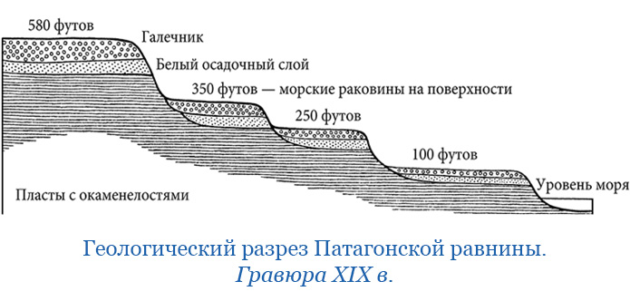 Всё на этом южном материке совершается в грандиозных масштабах: вся суша от Ла-Платы до Огненной Земли, на протяжении 1200 миль, поднялась (в Патагонии до высоты от 300 до 400 футов) в тот период, когда уже существовали современные морские моллюски. Старые выветрелые раковины, которые остались на поверхности поднявшейся равнины, еще сохраняют частично свою окраску. Процесс поднятия прерывался по меньшей мере восемью продолжительными периодами покоя, в течение которых море снова глубоко врезалось в сушу, образуя на последовательных уровнях длинные ряды обрывов или уступов, отделяющих друг от друга равнины, поднимающиеся подобно ступеням одна над другой.