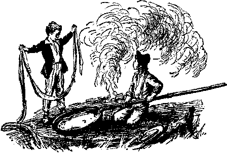 Зато с пирогом была возня: мы с ним просто замучились. Мы его месили в лесу и пекли там же; в конце концов все сделали, и довольно прилично, но не в один день; мы извели три полных таза муки, пока его состряпали, обожгли себе все руки» и глаза разъело дымом; нам, понимаете ли, нужна была одна только корка, а она никак не держалась, все проваливалась. Но в конце концов мы все–таки придумали, как надо сделать: положить в пирог лестницу да так и запечь вместе. Вот на другую ночь мы уселись вместе с Джимом, порвали всю простыню на узенькие полоски и свили их вместе, и еще до рассвета получилась у нас замечательная веревка, хоть человека на ней вешай. Мы вообразили, будто делали ее девять месяцев.
