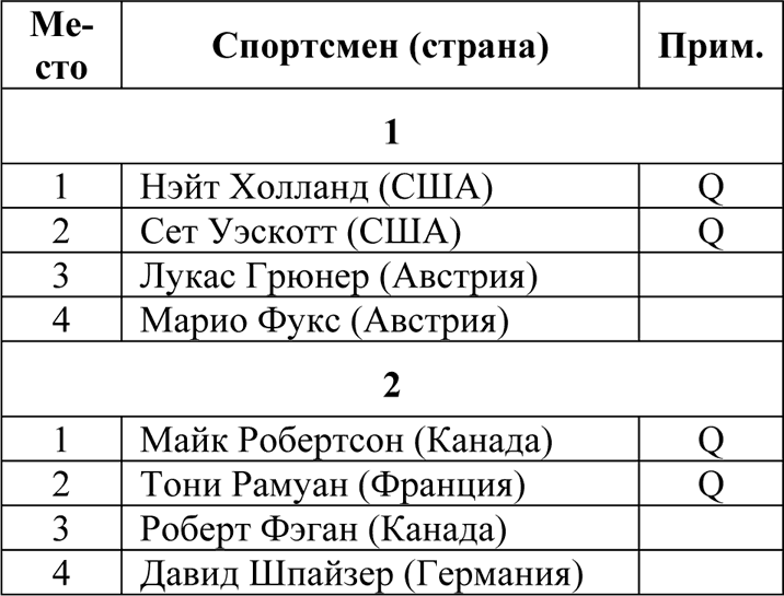 Квалификация. В квалификациионном раунде в первом спуске пары определяются по жребию, во втором – по результатам первого спуска; в плей-офф выходят 16 лучших по сумме времени двух спусков.