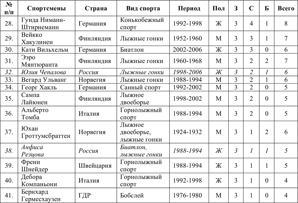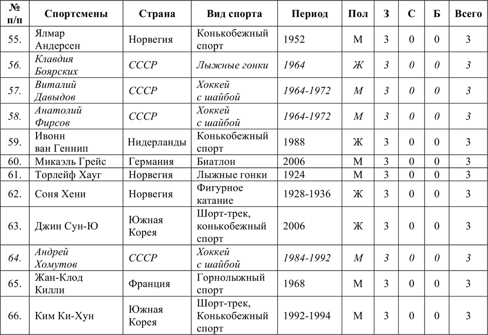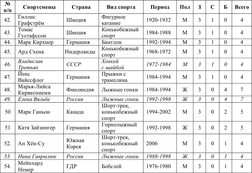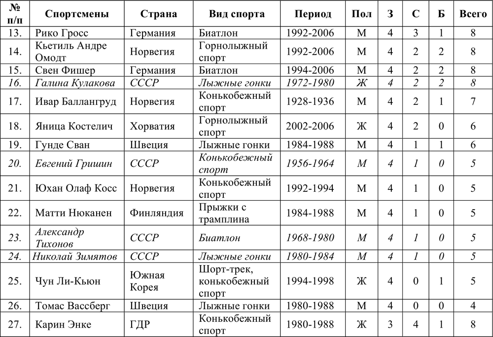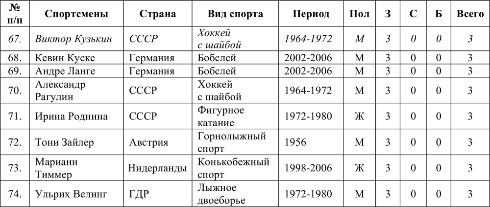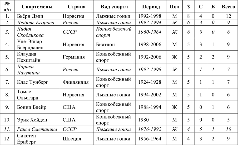 МНОГОКРАТНЫЕ ЧЕМПИОНЫ ЗИМНИХ ОЛИМПИЙСКИХ ИГР (1924–2010) (не менее трёх золотых медалей)