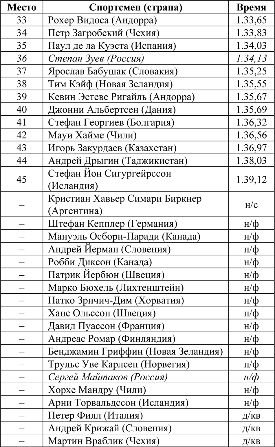 Олимпийский чемпион Турина-2006 в этой дисциплине австриец Бенджамин Райх выступал и в Ванкувере, но занял шестое место. Райх закончил первую попытку шестым, а во второй выигрывал по сумме двух попыток у лидировавшего на тот момент норвежца Янсруда, когда ошибся на середине трассы, сбив одни из ворот, из-за чего показал более низкий результат. Два других призёра Турина-2006 – Жоэль Шеналь и Херманн Майер – не участвовали.