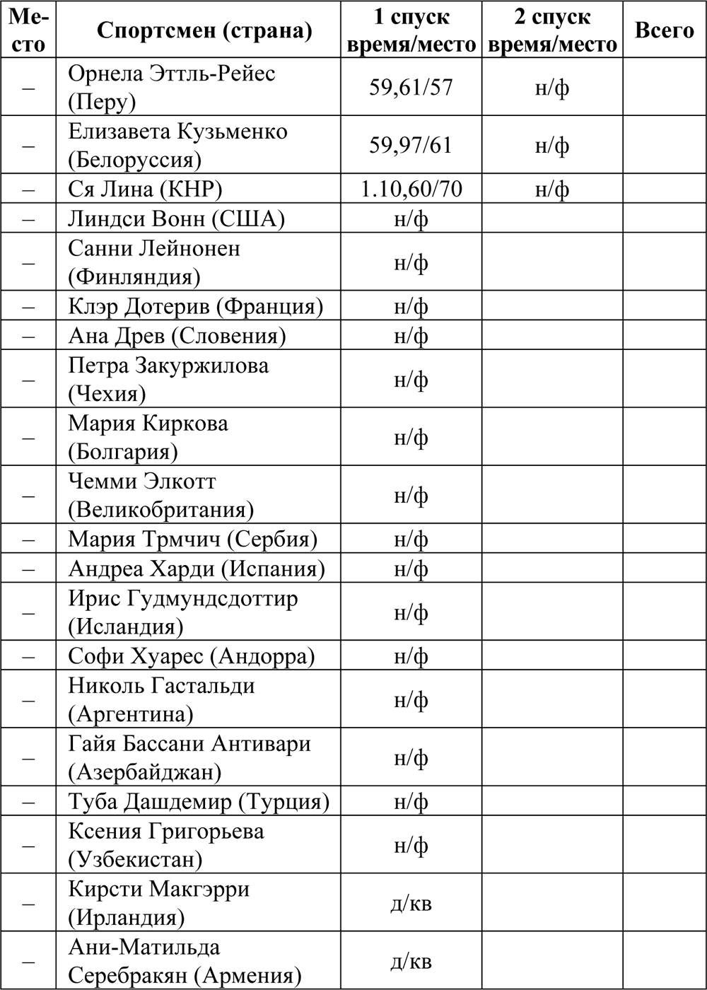 Соревнования прошли 26 февраля. Принимали участие 87 спортсменок из 46 стран мира. Во второй попытке 30 лучших горнолыжниц по результатам первой попытки стартовали в обратном порядке с 30-го места по первое. Занявшие в первой попытке места с 31-го и ниже стартовали после этого в прямом порядке.