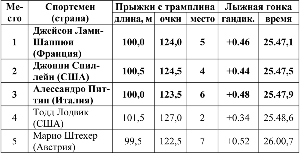 Во время лыжной гонки преследования большая группа спортсменов, стартовавших с отставанием от лидера в районе 40–50 секунд, довольно быстро догнала не обладавшего хорошей лыжной техникой и к тому же упавшего на одном из спусков Рююнянена. За два с половиной километра до финиша лидирующая группа состояла из семи спортсменов: Спиллейн, Лодвик, Лами-Шаппюи, Питтин, Койвуранта, Штехер и Кобаяси. Затем их догнал Билл Демонг. За 800 метров до финиша Кобаяси предпринял неудачную попытку уйти в отрыв. Сразу после этого на предфинишном подъёме Джонни Спиллейн ушёл в отрыв, но уже непосредственно во время финишного спурта его обогнал Джейсон Лами-Шаппюи, ставший первым французским олимпийским чемпионом в двоеборье с 1992 года. Кроме того, для США и Италии это были первые олимпийские медали в двоеборье. Никто из призёров ранее не выигрывал медали Олимпийских игр.