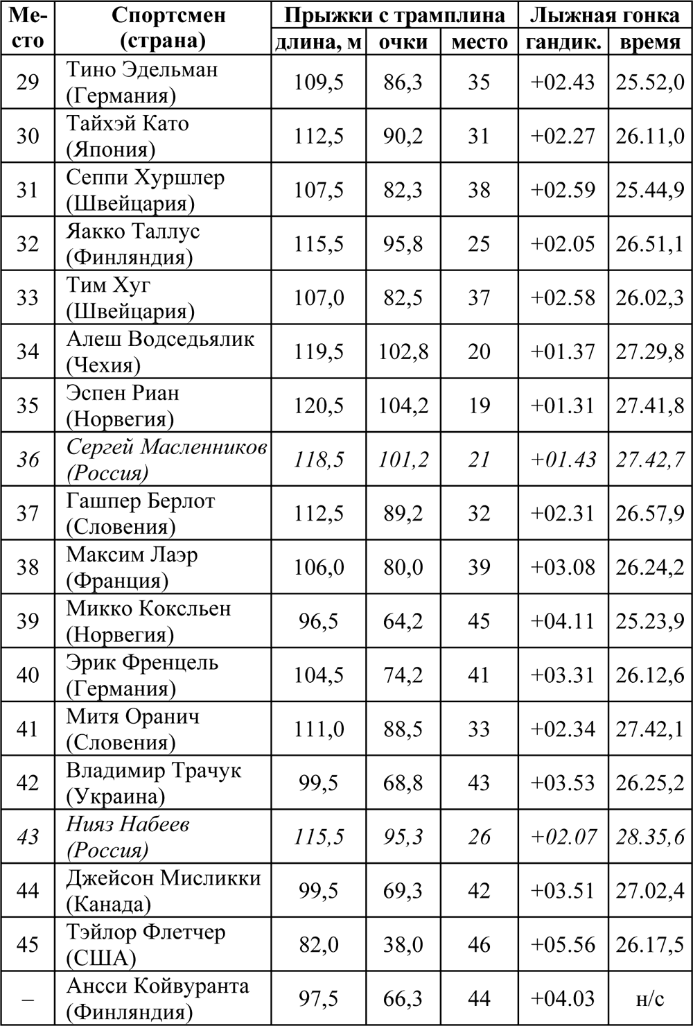 Соревнования прошли 14 февраля. Принимали участие 45 спортсменов из 14 стран мира. После прыжков с трамплина лидировал Янне Рююнянен, а два спортсмена, серебряный и бронзовый призёры Олимпийских игр 2006 года Магнус Моан и Феликс Готтвальд, стали 40-м и 41-м соответственно.