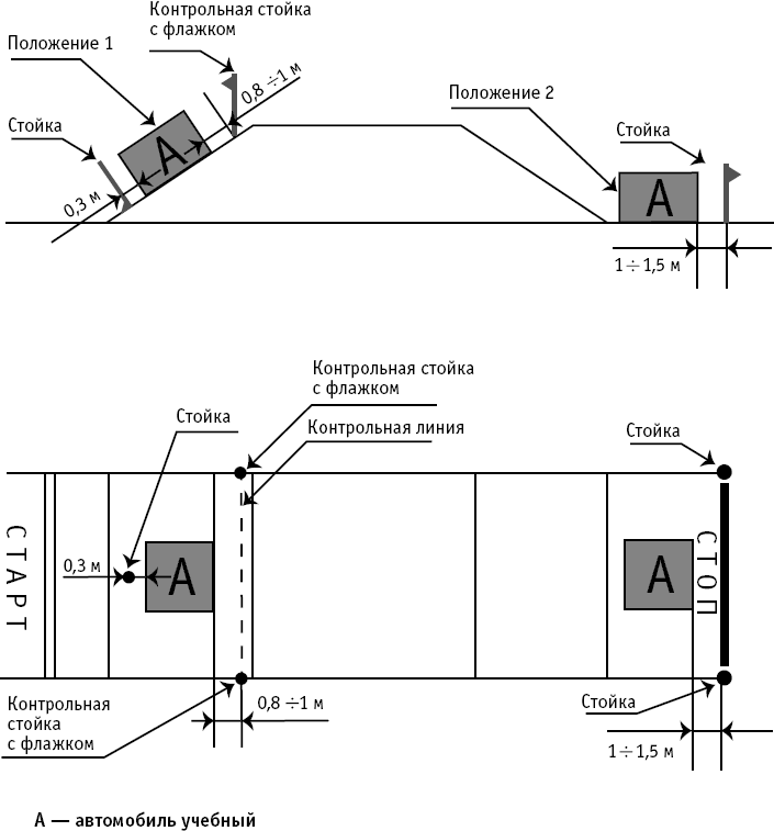 1. От линии «СТАРТ» въезжайте на подъем, и остановитесь за 70–80 см до контрольной линии. На практике эта линия частенько стерта, но проходит она между двумя стойками с флажками (положение 1 на рис. 1).