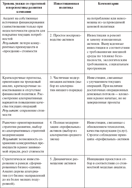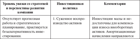 В предыдущих главах нами рассматривались многообразные решения по изменению основного капитала компании. Выделим наиболее распространенные виды инвестиционной политики в российских компаниях. Таких видов шесть. Характеристики по ним даны в табл. 42.
