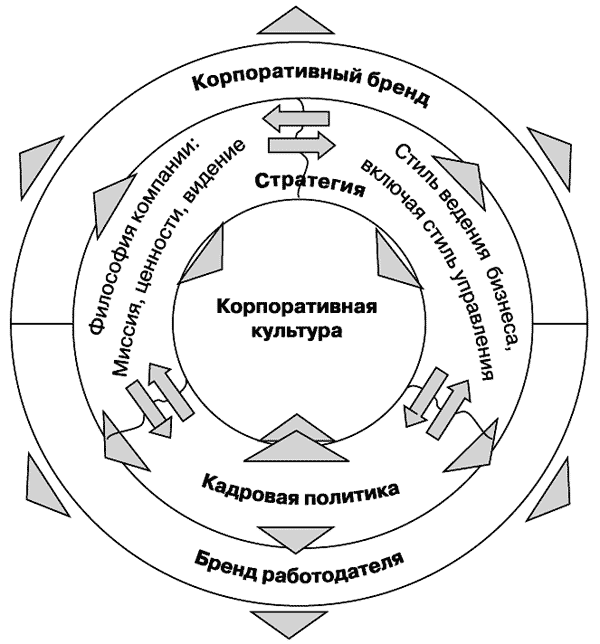 Приведенная схема наглядно показывает связь между брендом и корпоративной культурой. Очевидно, что философия компании, стиль управления и ее стратегия формируют бренд, а вместе с кадровой политикой – бренд компании как работодателя. Формирование происходит с учетом интересов всех целевых групп. Для бренда компании это: