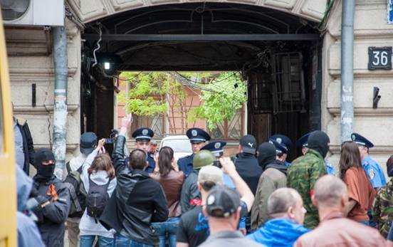 [Вот как об этом пишет в статье «Месяц спустя после трагедии: что мы знаем о майской бойне» журналист Интернет-издания «Таймер» Юрий Ткачев, который входит в группу по расследованию трагических майских событий, созданную при одесской облгосадминистрации: «Мы знаем о попытке активистов Куликова поля около 14:50 захватить штаб «Евромайдана» на Жуковского, 36, где, по их информации, находилось огнестрельное оружие (от себя добавлю, что оружие там действительно находилось). Эта попытка окончилась ничем: вход во двор оперативно перегородили в две линии «евромайдановцы» и сотрудники милиции»]