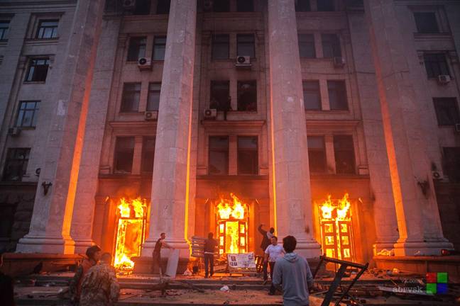 Майдановцы» подкидывают деревянные поддоны и бумажные плакаты для лучшего распространения огня, а «куликовцы», заблокированные на 3-м этаже, пытаясь выжить, стараются выбраться на карниз
