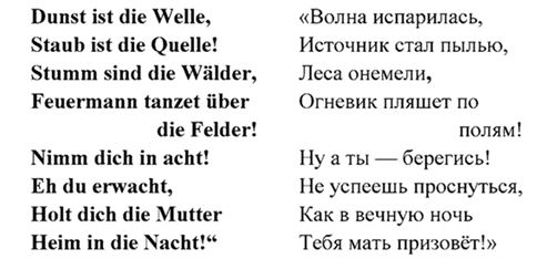 „Nimm dich in acht!Eh du erwacht,Holt dich die MutterHeim in die Nacht!“„Das ist das Spr"uchlein der Regentrude (это заклинание Регентруды)!“ rief Frau Stine (воскликнула госпожа Стина; rufen); „und nun rasch noch einmal (а сейчас скорее ещё раз)! Und du, Maren, merk wohl auf (а ты, Марен, запоминай хорошенько; aufmerken), damit es nicht wiederum verloren geht (чтобы оно снова не забылось; verlieren – терять, утрачивать; verloren gehen – теряться, пропадать)!“