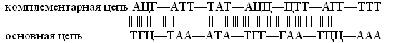 2. С помощью того же принципа комплементарности по фрагменту основной цепи построим иРНК, учитывая, что в молекулах РНК А комплементарен У (нет Т), а Г комплементарен Ц.