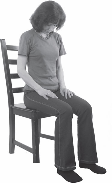 2. Положите руки расслабленно и свободно на колени ладонями вниз, пальцы слегка согните. Выпрямите шею, голову поставьте вертикально, а затем свободно и расслабленно слегка склоните ее к груди. Следите, чтобы в шее не было никакого напряжения.