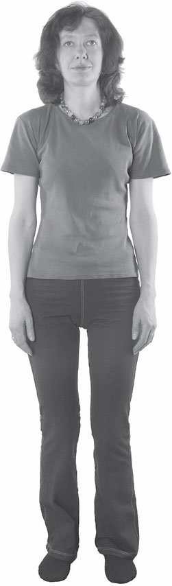 1. Исходное положение: встаньте прямо, выпрямив ноги, но так, чтобы колени оставались свободными, чуть смягченными (чтобы не было ощущения жесткой фиксации ноги в коленных суставах). Стопы поставьте параллельно, рядом друг с другом, но так, чтобы они не касались друг друга. Почувствуйте, что вся поверхность стоп полностью плотно прилегает к полу.