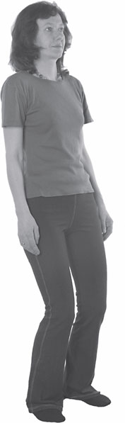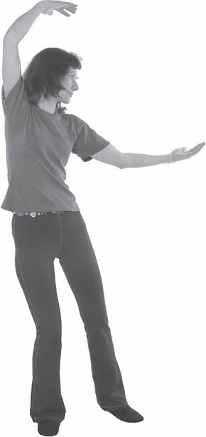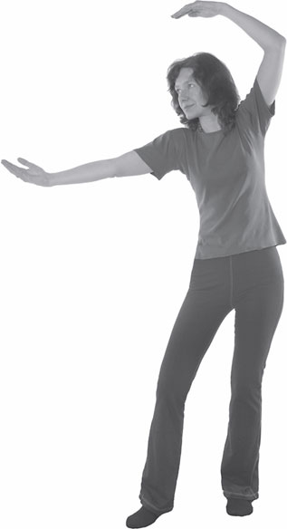 7. Начиная делать выдох через рот, перенесите центр тяжести на левую ногу, слегка сгибая ее в колене; правая нога при этом выпрямляется, ее пятка отрывается от пола, а носок упирается в пол. Одновременно правая рука распрямляется и вытягивается в сторону ладонью вверх, а левая рука сгибается в локте и по дуге заводится над головой ладонью вниз. Корпус при этом движении немного наклоняется влево с небольшим разворотом назад.