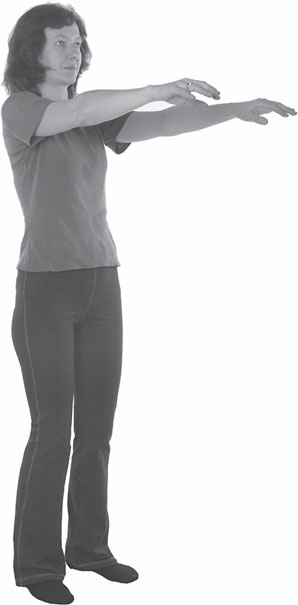 4. Начинайте делать следующий вдох – очень медленно, приготовившись к тому, что на одном вдохе вы будете делать несколько последовательных движений. В начале вдоха медленно поднимите руки вперед, параллельно друг другу, одновременно начиная медленно распрямлять колени.