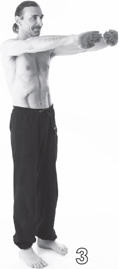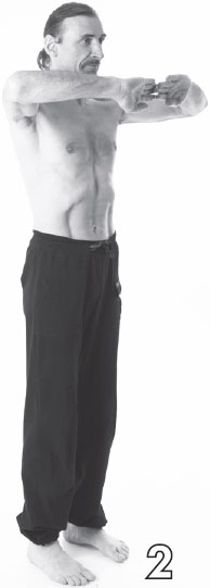 2. Поднимите руки на уровень груди, ладони разверните наружу. Тыльные стороны ладоней касаются груди, кончики пальцев соприкасаются.