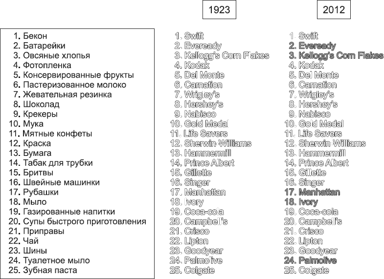 Оказалось, что большинство брендов сохраняли свои позиции в сознании людей в течение 90 лет! Главный парадокс, однако, заключается в том, что целый ряд соответствующих продуктов был снят с производства за 20 лет до проведения опроса! На рисунке выделены бренды, потерявшие свои позиции в сознании опрошенных респондентов.