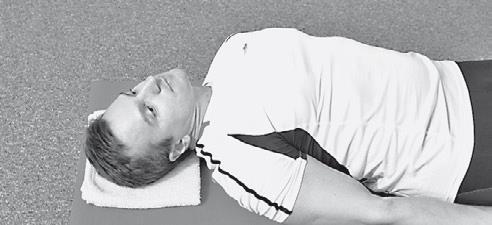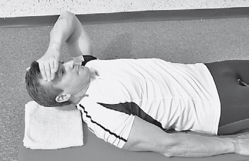 5. «Разгибание шеи лежа с помощью рук». ИП: лежа на спине, кисть одной руки располагается на лбу. Степень сложности: СРЕДНЯЯ.
