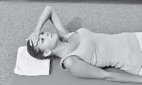9. «Наклон шеи в сторону лежа с помощью руки после сопротивления». ИП: лежа на спине, кисть одной руки располагается на одноименном виске. Степень сложности: ВЫСОКАЯ.