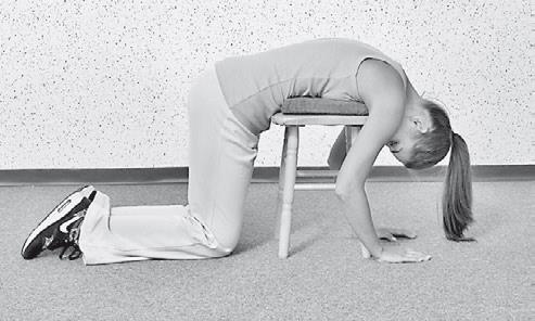 61. «Полное расслабление позвоночника на табурете». ИП: лежа на табурете лицом вниз. Табурет располагается под грудной клеткой и верхней частью живота. Мягкий валик из полотенца позволяет полностью перенести вес тела на табурет. Степень сложности: ЛЕГКАЯ.
