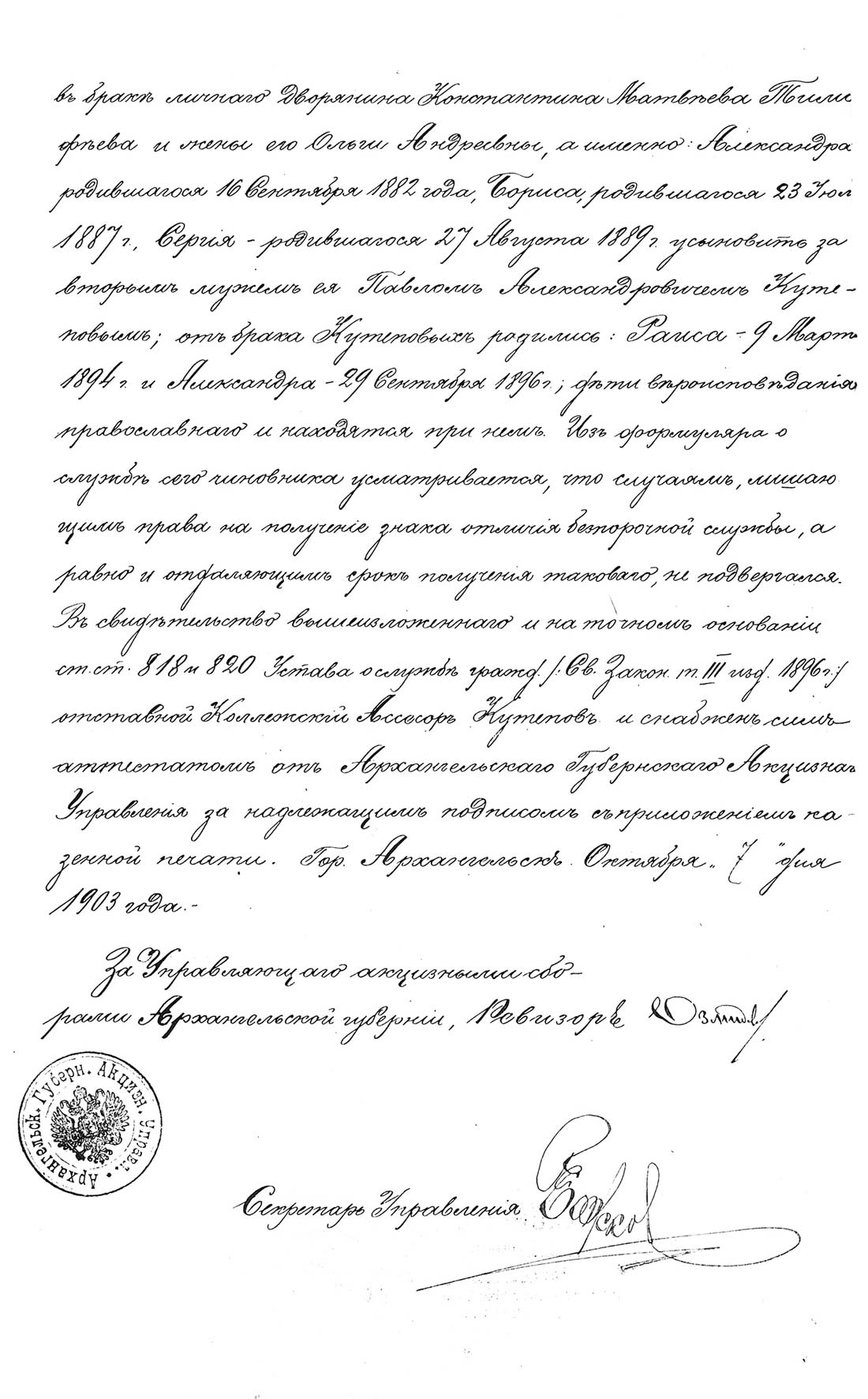 Интересно, что восприемниками (крестными) у новорожденных Кутеповых были люди, известные не только на уездном, но и на губернском уровне. Например, Николая и Александру крестили директор Архангельского технического училища инженер-технолог статский советник (что соответствовало пятому классу Табели о рангах) Павел Иванович Кусонский и Надежда Александровна Поплавская, жена капитана Холмогорской команды, а крестными Марии были холмогорский уездный исправник надворный советник Константин Христианович Ринек и жена уездного врача Зинаида Александровна Боброва. Круг общения Кутеповых – это: статский советник (чин соответствовал генеральскому), надворный советник (подполковнику), семейство врача. Как видно, Павел Александрович был человеком известным и уважаемым в холмогорском обществе.