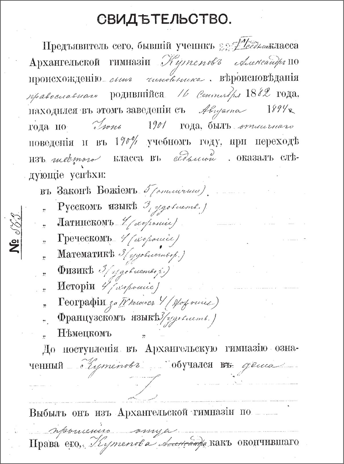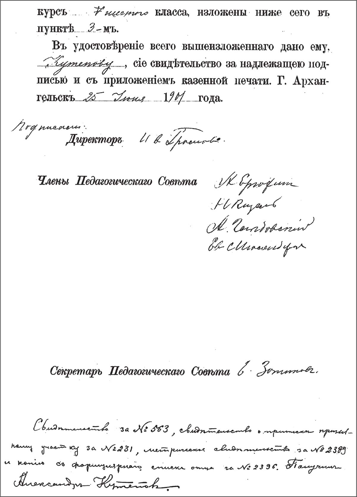 Свидетельство об окончании Александром Кутеповым шести классов Архангельской губернской гимназии. С автографом А. П. Кутепова (лист 1) (ГААО. Ф. 127. Он. 1. Д. 550. Л. 225–225 об.)