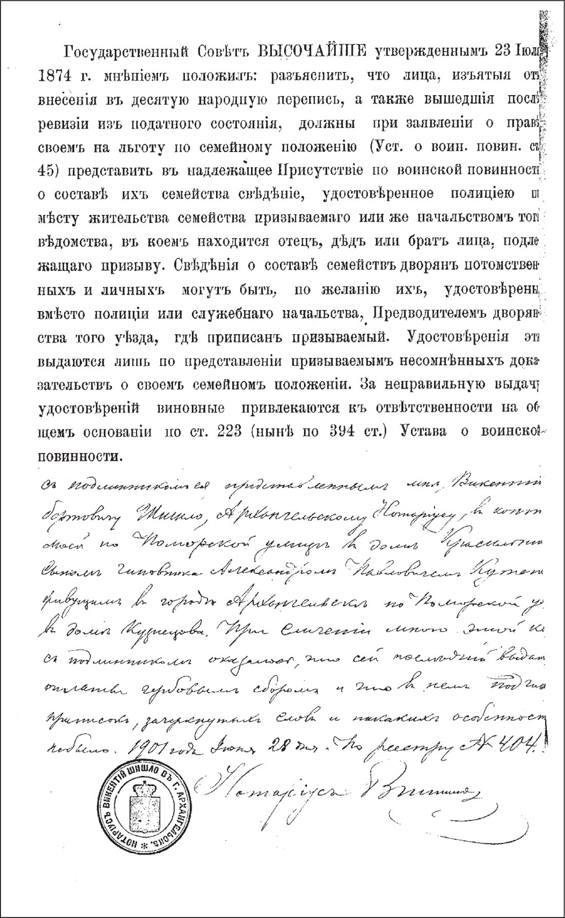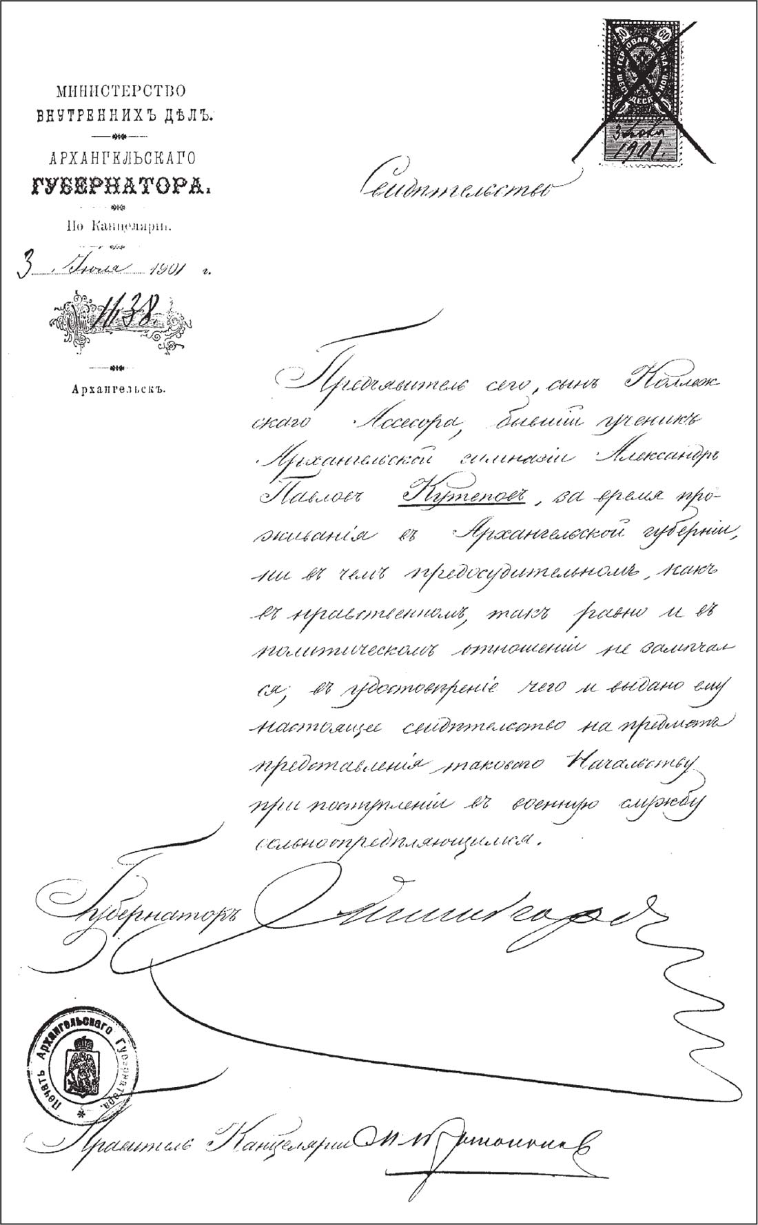 Свидетельство о нравственной и политической благонадежности, выданное А. П. Кутепову в канцелярии архангельского губернатора для поступления на военную службу (ГААО. Ф. 1244. Оп. 1. Д. 591. Л. 38)