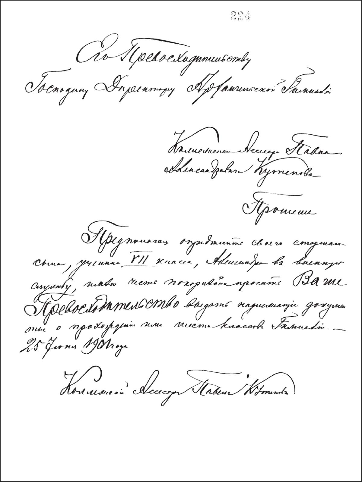 Прошение П. А. Кутепова на имя директора Архангельской гимназии о выдаче Александру Кутепову документов об окончании им шести классов для поступления на военную службу (ГААО. Ф. 127. Оп. 1. Д. 550. Л. 224)