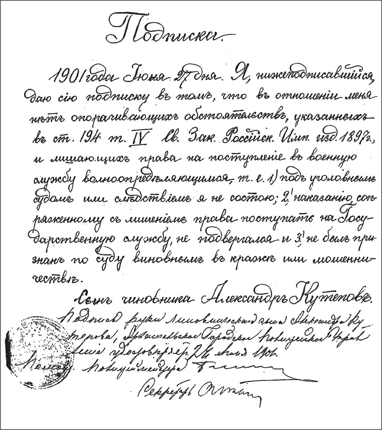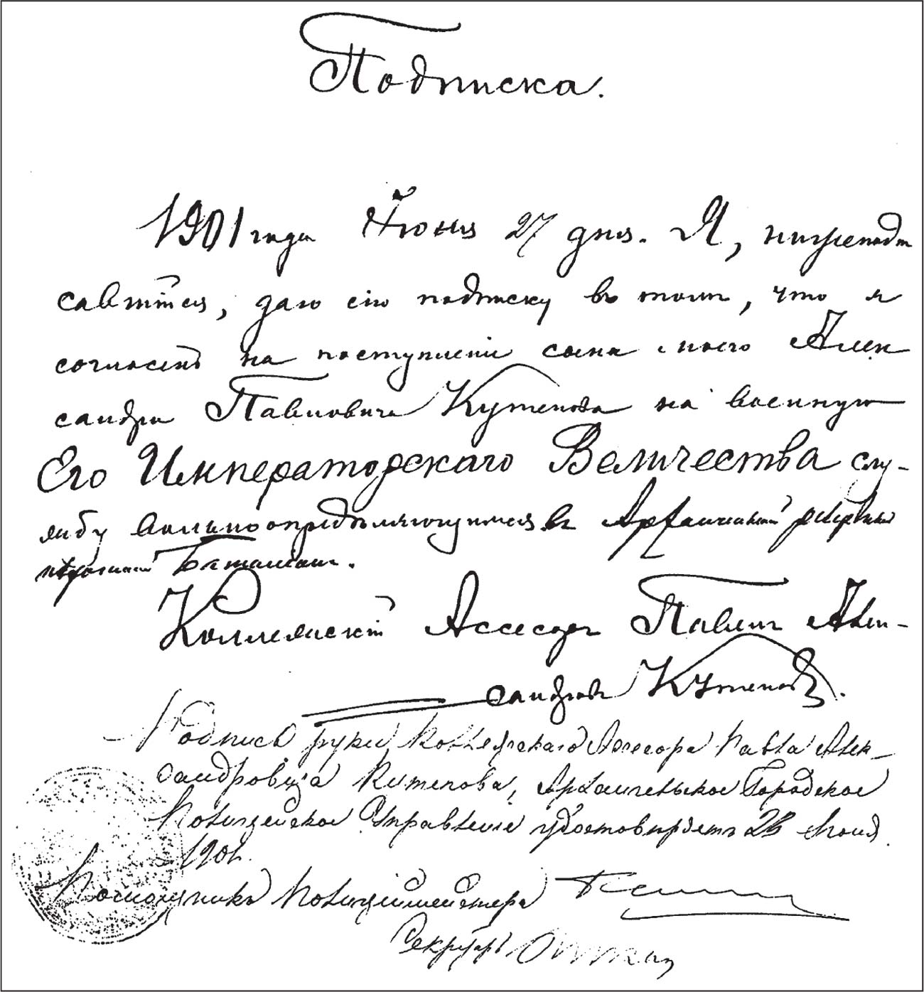 Подписка П. А. Кутепова о согласии на поступление А. П. Кутепова на военную службу (ГААО. Ф. 1244. Оп. 1. Д. 591. Л. 37)
