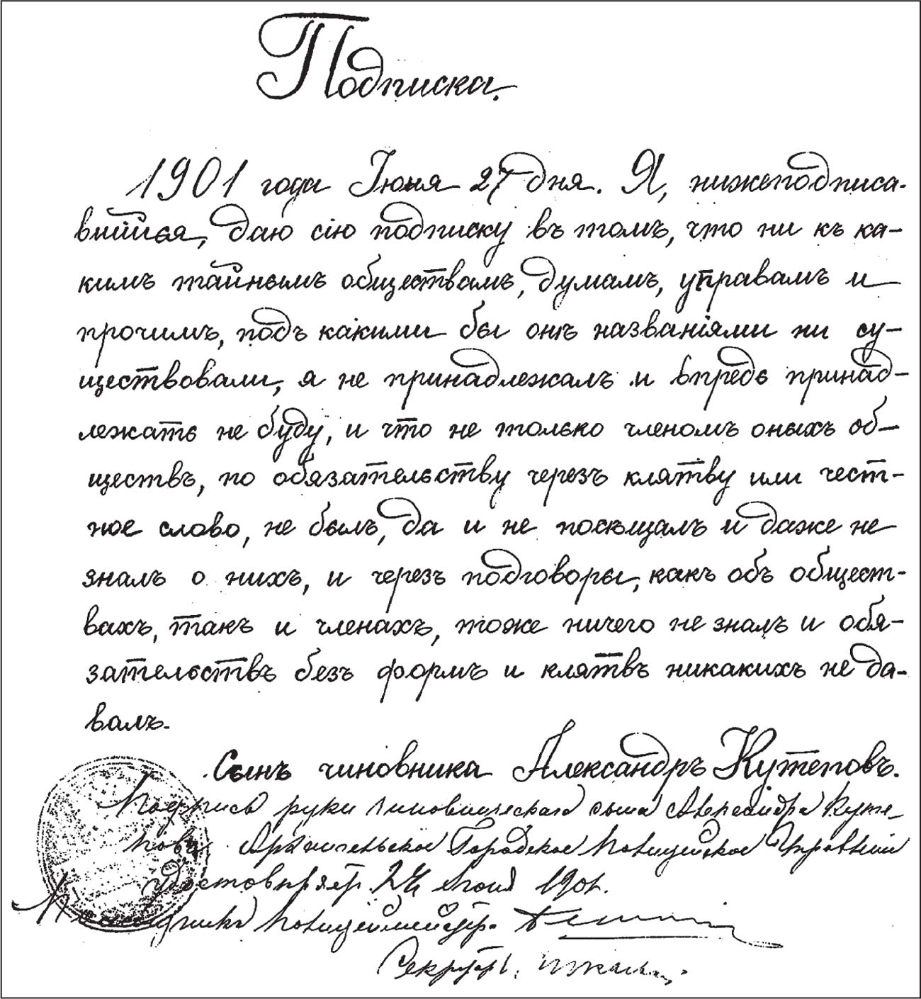 Подписка Александра Кутепова о политической благонадежности, данная им при поступлении на военную службу. Автограф А. П. Кутепова (ГААО. Ф. 1244. Оп. 1. Д. 591. Л. 35)