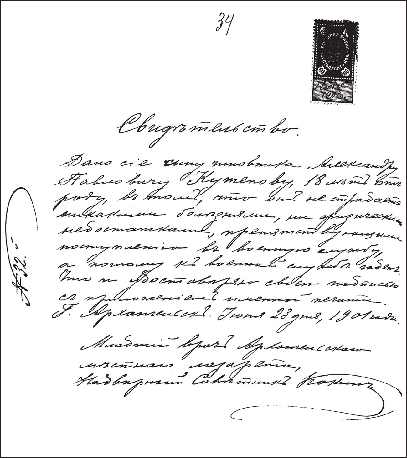Медицинское свидетельство, выданное Александру Кутепову при поступлении на военную службу (ГААО. Ф. 1244. Оп. 1. Д. 591. Л. 34)