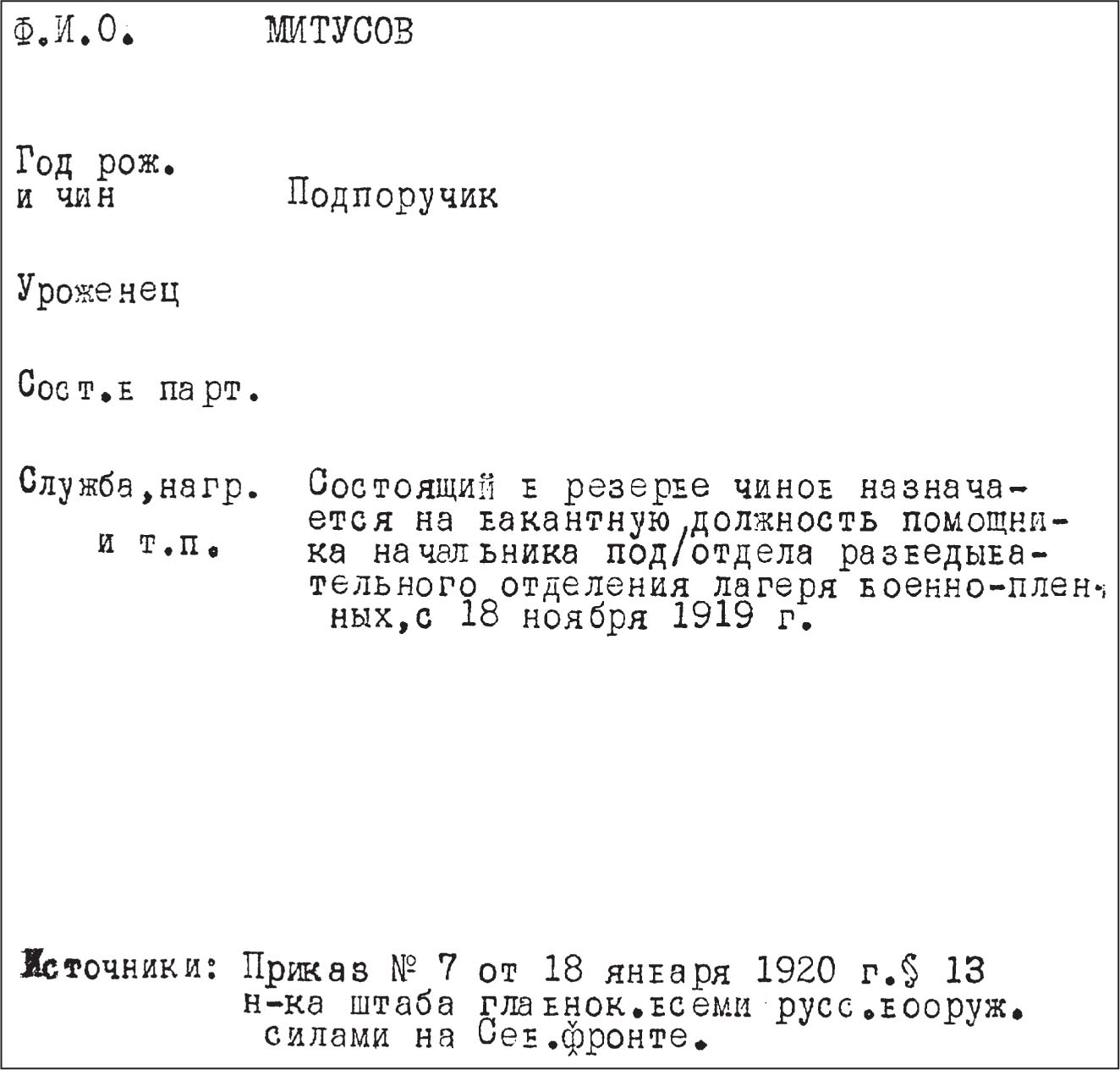 1-й лист личной карточки С. С. Митусова из дела Архангельской Губчека (ГААО. Ф. 2617. Оп. 1. Д. 23. Л. 200. Арх. Губчека. Личные карточки)