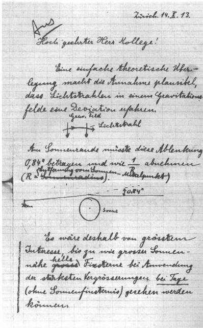 В этом письме американскому астроному Джорджу Эллери Хейлу в октябре 1913 года Эйнштейн объясняет возможность того, что «световые лучи отклоняются в гравитационном поле», и предполагает, что, в случае солнечной массы и очень близко от звезды, это отклонение достигает 0,84" и уменьшается пропорционально 1/R, где R – расстояние между лучом и центром Солнца. Эта идея представляет собой зачаток эксперимента, который в 1919 году доказал общую теорию относительности.