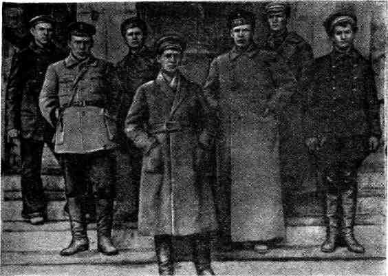 Первый ряд (слева направо): комендант главного штаба Северного летучего отряда Горелов, командир Северного летучего отряда С. Павлов, комиссар матросского отряда П. Щекин, командир матросского отряда И. Сафонов.