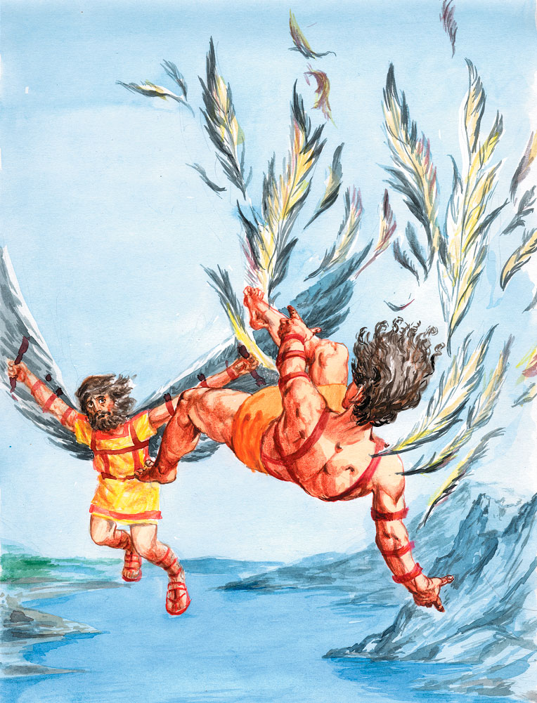 С тех пор люди стали замечать, что Дедал повсюду собирает птичьи перья. Ходит по лесам и полям, специально выбирает такие места, где гнездятся птицы, и все перья, которые находит, складывает в большой мешок. Скоро у него набралось уже много перьев, и он принялся за работу. Скреплял перья льняными нитками, заливал их растопленным воском, а потом стал сооружать из этих заготовок четыре больших крыла, как у птиц. Его сын Икар возился рядом с отцом и помогал ему топить воск. Он не очень понимал, что делает отец, но ему нравилось это занятие.