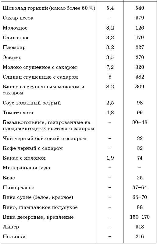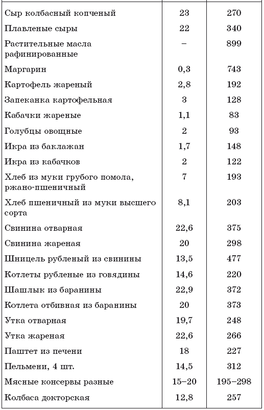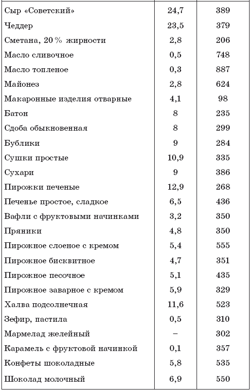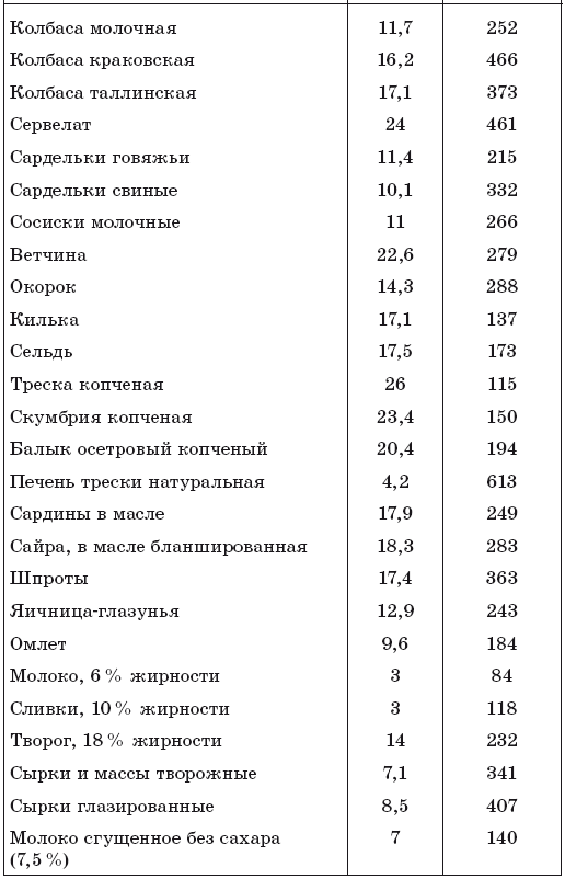 Таблица содержания различных жирных кислот в пищевых продуктах на единицу веса или объема