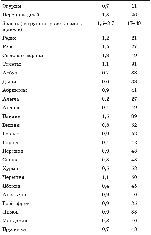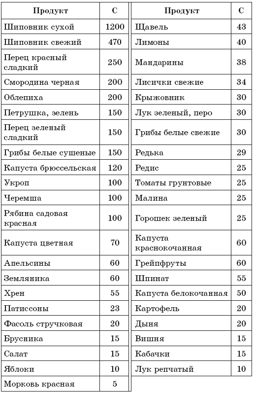 Таблица содержания витамина C в продуктах (мг/100 г продукта)