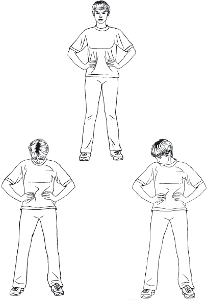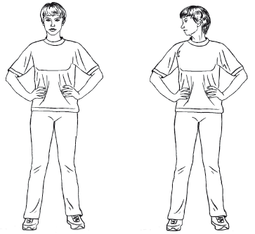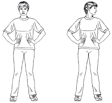 Исходное положение: станьте прямо, ноги на ширине плеч, руки на поясе, голову держите прямо, взгляд направлен вперед.