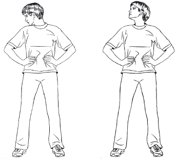 Исходное положение: станьте прямо, ноги на ширине плеч, руки расположены на поясе.