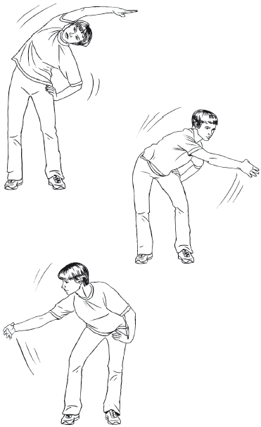 Слегка согните колени, поднимите вверх правую руку и потянитесь как можно выше, не поднимая при этом вверх плечо. Левую руку опустите на бедро, подтяните ягодицы, подайте таз вперед-вверх, вытяните правую руку еще больше и выполните медленный наклон в сторону, продолжая вытягивать руку. Расслабьте шею и верхний плечевой пояс и мягко, с амплитудой в несколько сантиметров, выполните наклоны в сторону. Чтобы вернуться в исходное положение, переведите правую руку в положение перед собой, согните колени, наклонитесь вперед, и, не сгибая руку, выполните движение рукой и туловищем в левую сторону. Перед тем как вернуться в исходное положение, подтяните ягодицы, подайте таз вперед-вверх и станьте прямо. Выполните упражнение в другую сторону.