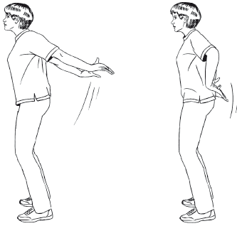 Слегка согните колени, подтяните ягодицы, подайте таз вперед-вверх. Затем поверните ладони внутренней стороной вверх, чтобы большие пальцы были направлены в потолок. Медленным движением переведите руки назад за спину и поднимите их так высоко, как только возможно. Отведите плечи и голову назад и мягко, с амплитудой в несколько сантиметров, выполните движения руками вперед-назад (слегка соединяя и разъединяя руки). После выполнения согните локти и опустите руки вниз.