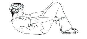 Возьмитесь руками за внутреннюю поверхность бедер и разведите локти в стороны-вверх. Плавным движением поднимите голову над поверхностью, плечи автоматически последуют за головой. Округлите верхнюю часть туловища так, чтобы нос был направлен внутрь грудной клетки.