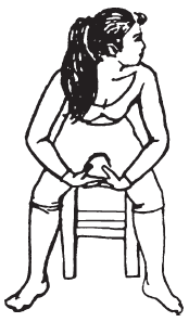 Примите исходное положение: сидя, ноги слегка разведены, предплечья расположены на бедрах, пальцы рук сплетены в замок, ладони обращены кверху.