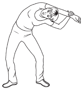 Примите исходное положение: встаньте прямо, ноги на ширине плеч, колени слегка согнуты, стопы развернуты наружу, правая рука прямая поднята вверх, левая рука согнута в локте и обхватывает правое предплечье.