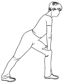 Примите исходное положение: сделайте шаг вперед левой ногой и станьте в выпад. Впередистоящая левая нога согнута в колене, сзадистоящая правая максимально выпрямлена, стопы направлены строго вперед и плотно прижаты к полу. Руки упираются в колено впередистоящей ноги, корпус слегка наклонен вперед, спина абсолютно прямая.