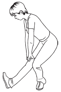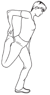 Примите исходное положение: встаньте прямо, согните правую ногу в колене и обхватите правой рукой правую стопу. Левую руку, для удержания равновесия выпрямите вперед или в сторону, или держитесь за опору.