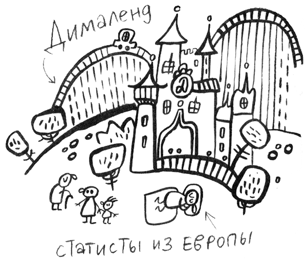 В Дималенде и вправду всё было как в настоящем. Американские горки, карусели, комнаты страха, тиры, автодромы, фудкорты… А для пущей достоверности Димин папа выписал две тысячи статистов из Европы. Они ходили по улицам, улыбались, размахивали руками и вообще всячески создавали нам хорошее настроение. А специально приглашённый из Вены камерный оркестр играл вальсы Штрауса. Но по просьбе дорогого гостя из солнечного Барнаула Юрки Гадова они перешли на репертуар группы «Рамштайн».