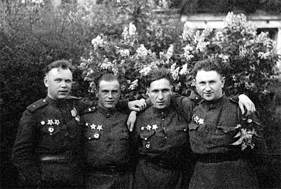 Встреча с «пуховцами» перед наступлением на Берлин. Слева направо: гв. м-р Соколов, гв. капитан Введенский С. М., гв. ст. л-т Шелемотов А. С., гв. м-р Сергеев П. И.