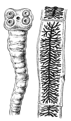 Длинное тело ленточного червя имеет различные отделы. Передний конец тела — это круглая головка с присосками.